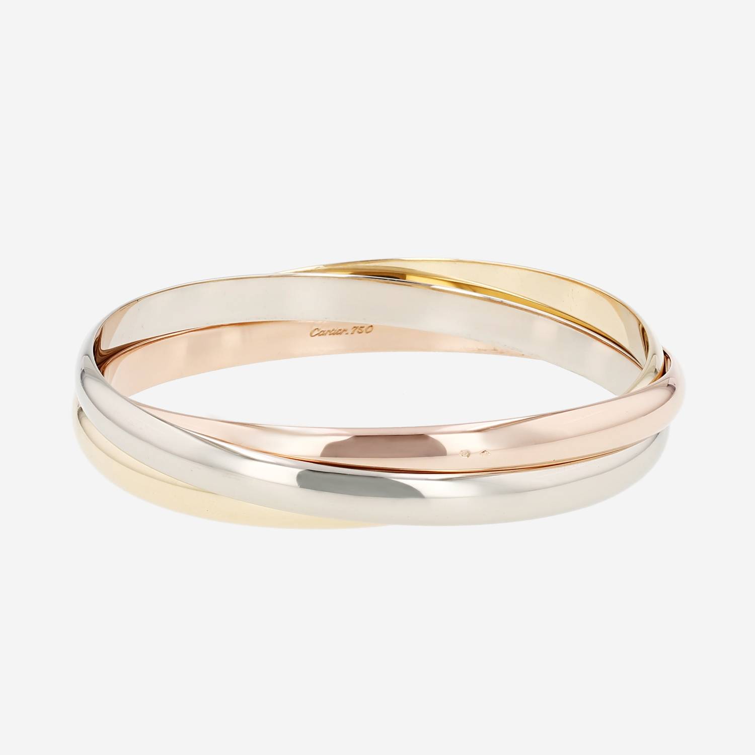 Intramontabile bracciale a cerchio Cartier Trinity modello grande in 3 ori, composto da una successione di 3 eleganti montature intrecciate in oro giallo, in oro rosa e oro bianco.