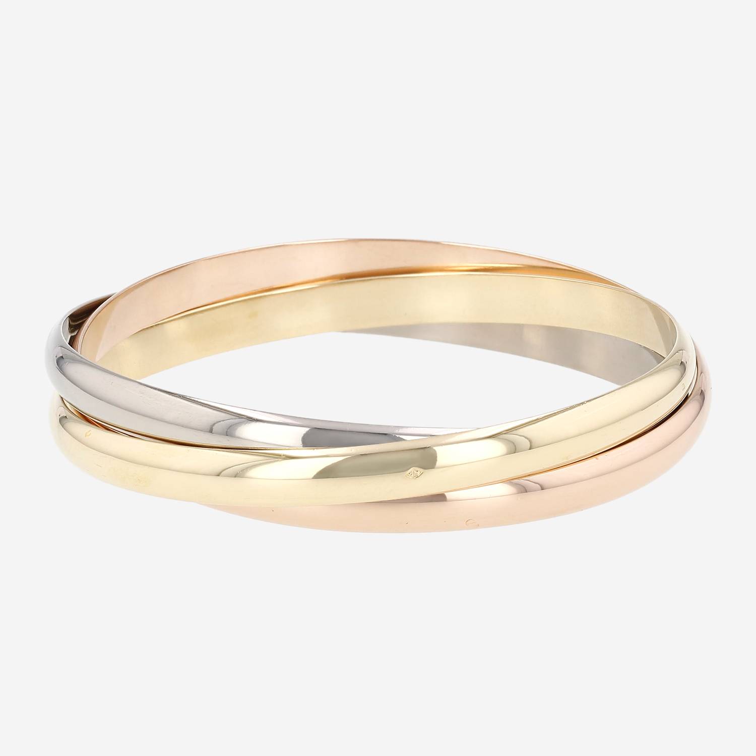 Bracciale Cartier Trinity in 3 ori, composto da una successione di 3 eleganti montature intrecciate in oro giallo, in oro rosa e oro bianco.