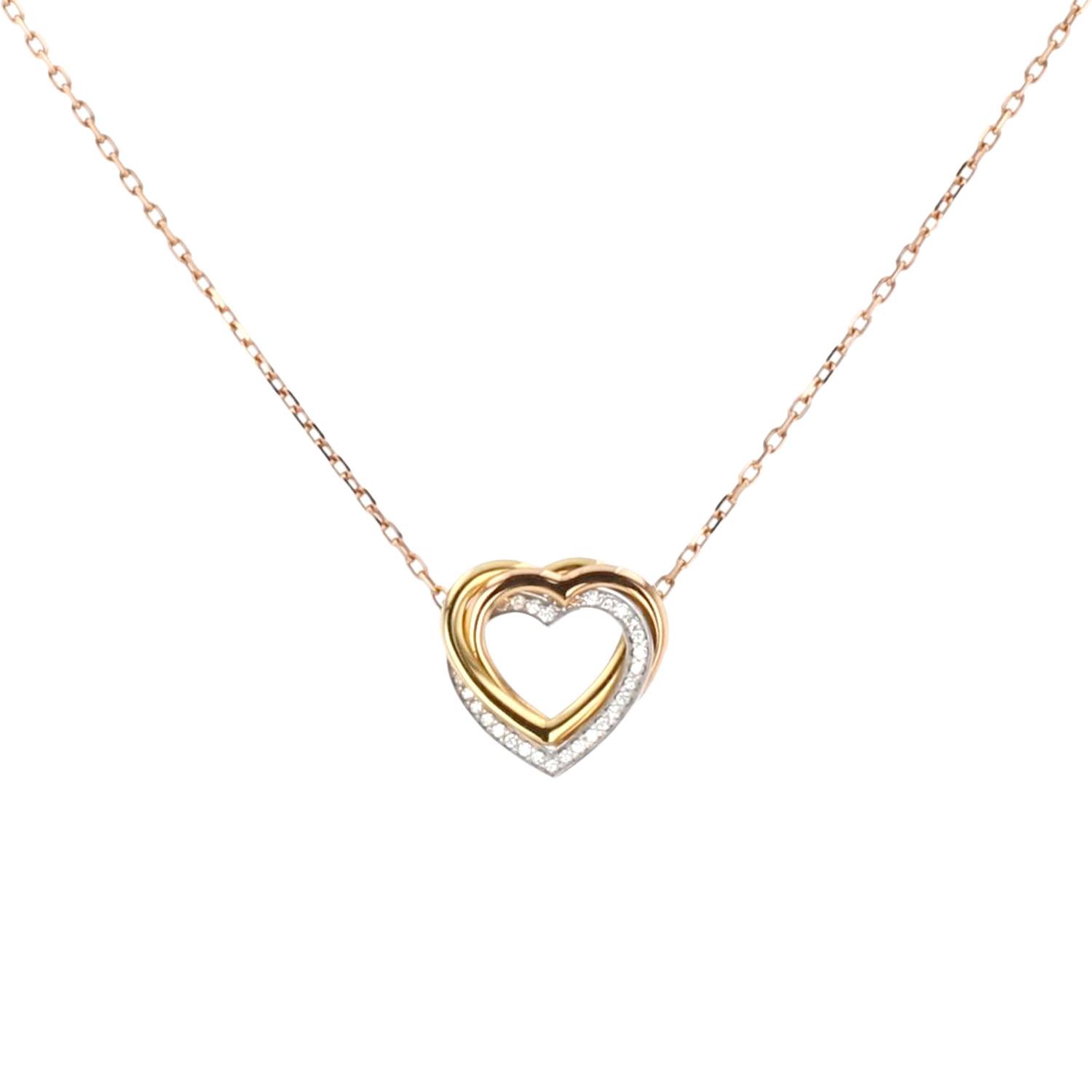 Collana Cartier Coeur Trinity in 3 ori e diamanti, dotata di un cuore intrecciato in oro rosa, in oro giallo e oro bianco parzialmente incastonato di diamanti con taglio a brillante, il tutto sostenuto da una catena a maglie forzatine in oro rosa.