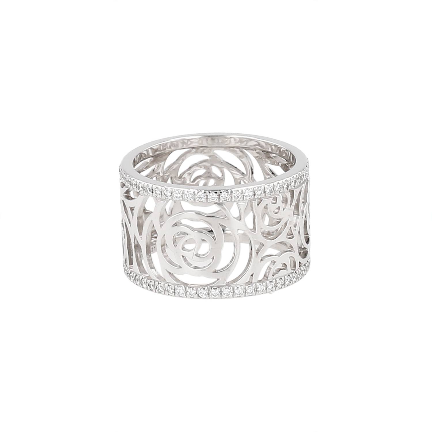 Anello a fascia Chanel Camélia Fil in oro bianco e diamanti, composto da un importante fascia in oro bianco, ornato di bellissima camelia traforata, arricchito sui bordi da un pavé in diamanti con taglio a brillante circa 0.45 carati.
