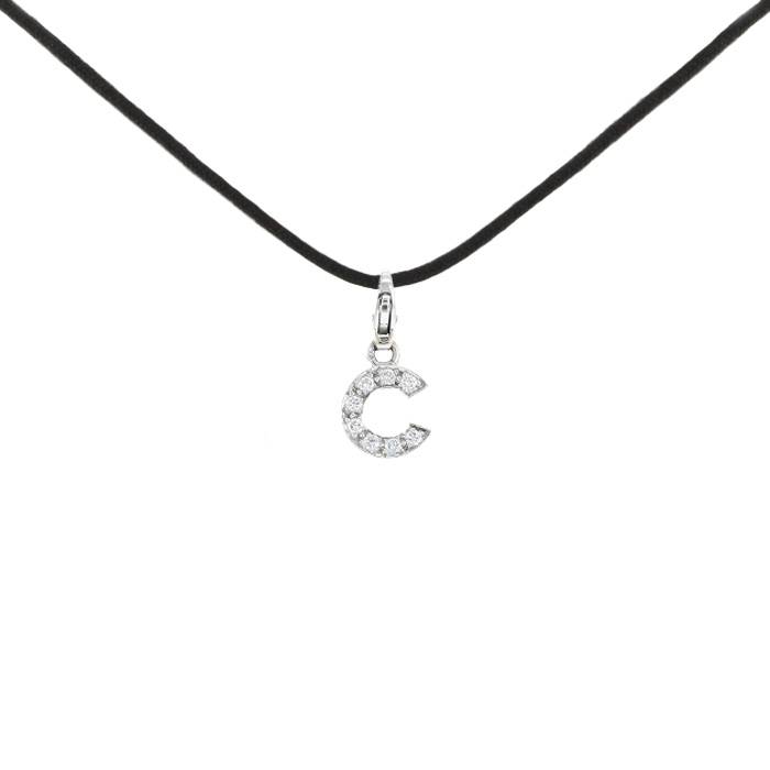 Ciondolo Chanel in oro bianco e diamanti, composto da la C in oro bianco elegantemente incastonata di diamanti con taglio a brillante 0.25 carati di circa.