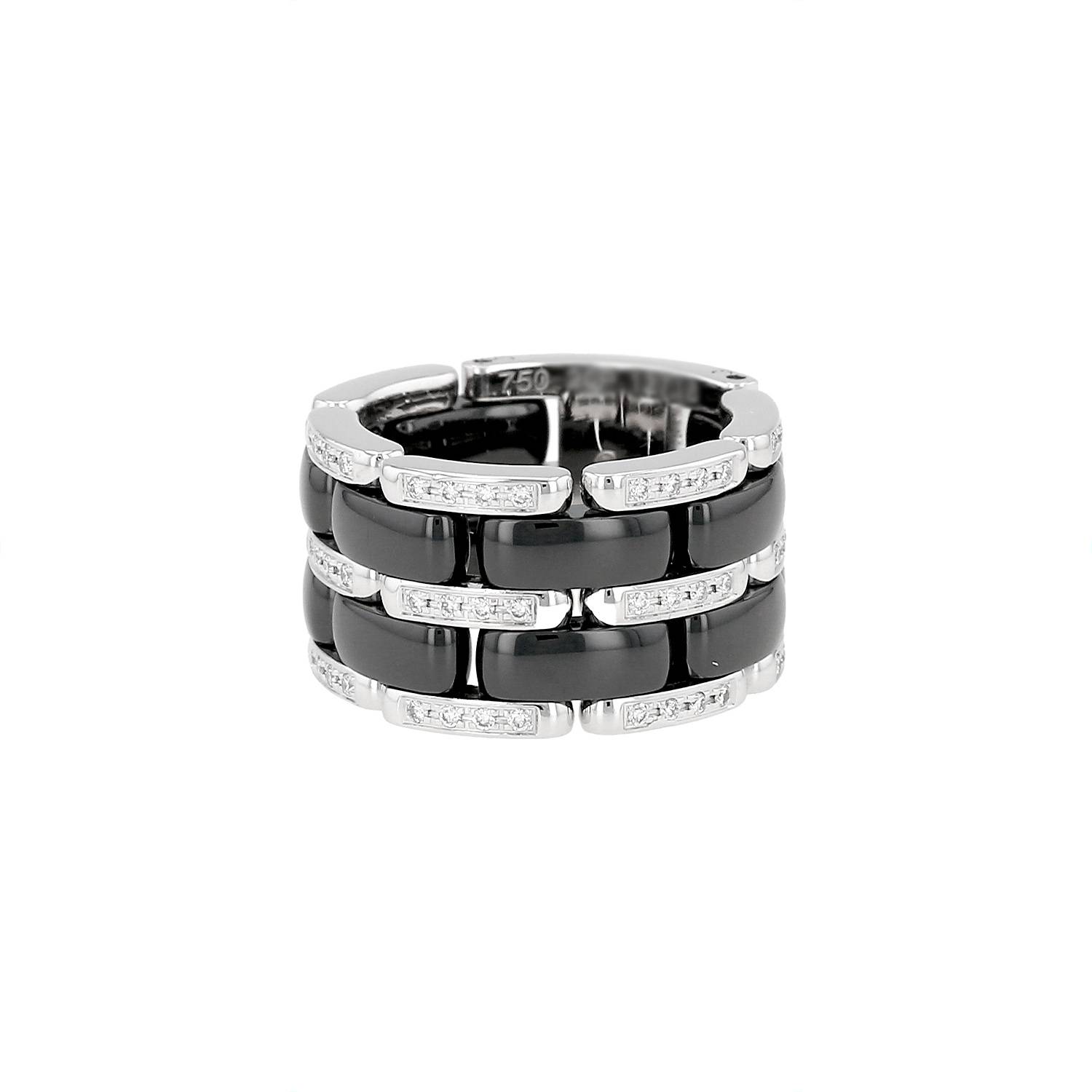 Bellissimo anello mobile Chanel Ultra modello grande in oro bianco, in ceramica, e diamanti, composto di un'alternanza di raffinate maglie bombate in ceramica nera, arricchito di bellissime maglie liscie in oro bianco delicatamente incastonate di diamanti con taglio a brillante.