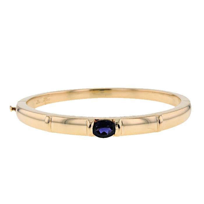 Splendido bracciale a cerchio della collezione "Anneau" in oro giallo e cordierite, composto da un importante giunco bombato in oro giallo, arricchito al centro da una bellissima cordierite con taglio ovale.