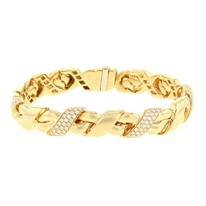 Elegante bracciale Chaumet in oro giallo e diamanti, composto da una successione di raffinate maglie geometriche intrecciate, arricchito sulla parte superiore belle fasce bombate parzialmente tempestate di diamanti con taglio a brillante.