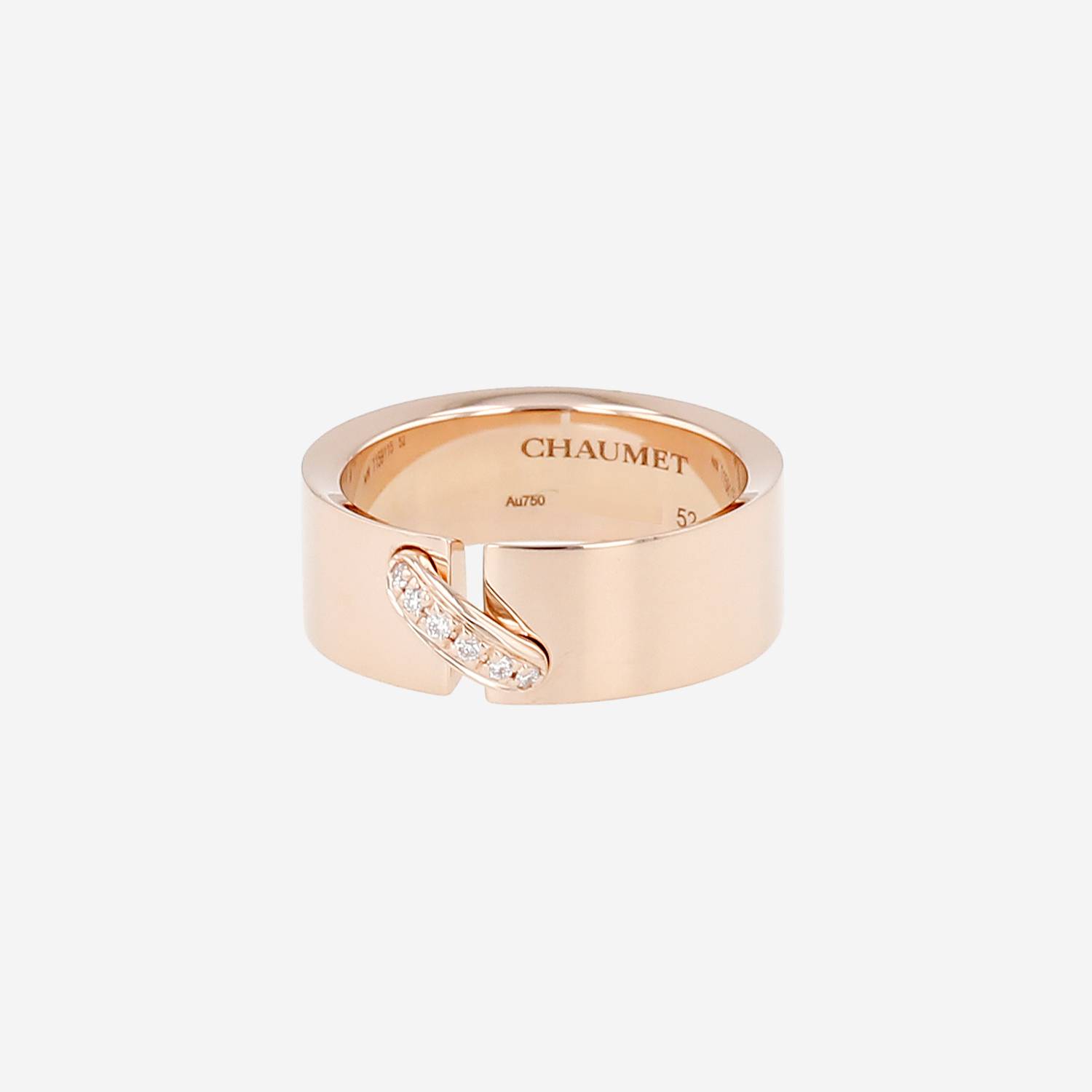 Anello Chaumet Lien modello medio in oro rosa e diamanti, composto da un elegante fascia aperta in oro rosa, ornato da un elemento di giunzione bombato delicatamente incastonato di diamanti con taglio a brillante.