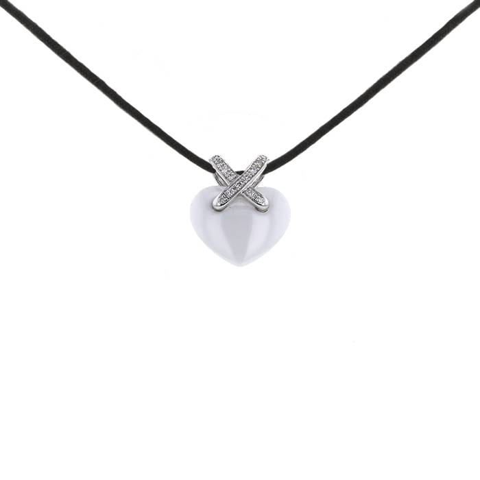 Bellissimo ciondolo Chaumet Lien in oro bianco, diamanti e ceramica bianca, composto da un elegante cuore bombato in ceramica bianca, ornato sulla parte superiore da un grazioso elemento di giunzione incrociato in oro bianco delicatamente incastonato di diamanti con taglio a brillante, il tutto sostenuto da un bello cordoncino in nylon nero.