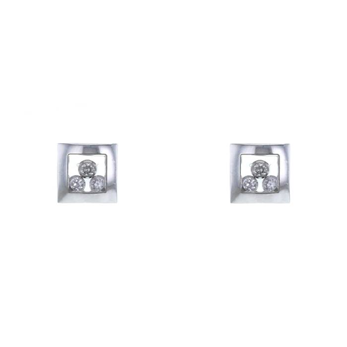 Bellissimi orecchini a perno Chopard Happy Curves in oro bianco e diamanti, composte di 2 bellissime motivi quadrati bombati in oro bianco, che sostengono al centro 6 raffinati diamanti mobili con taglio a brillante del peso totale di 0.20 carati.