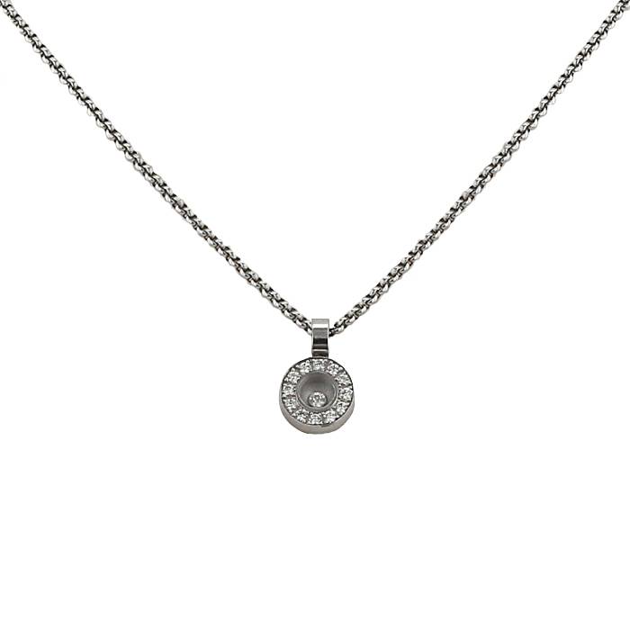 Bellissima collana Chopard Happy Diamonds Icon in oro bianco e diamante, composta da un grazioso motivo rotondo traforato in oro bianco delicatamente incastonato di diamanti con taglio a brillante da 0.23 carati totale, che sostengono al centro un piccolo diamante mobile con taglio a brillante del peso circa di 0.02 carati, il tutto sostenuta da una splendida catena in oro bianco.