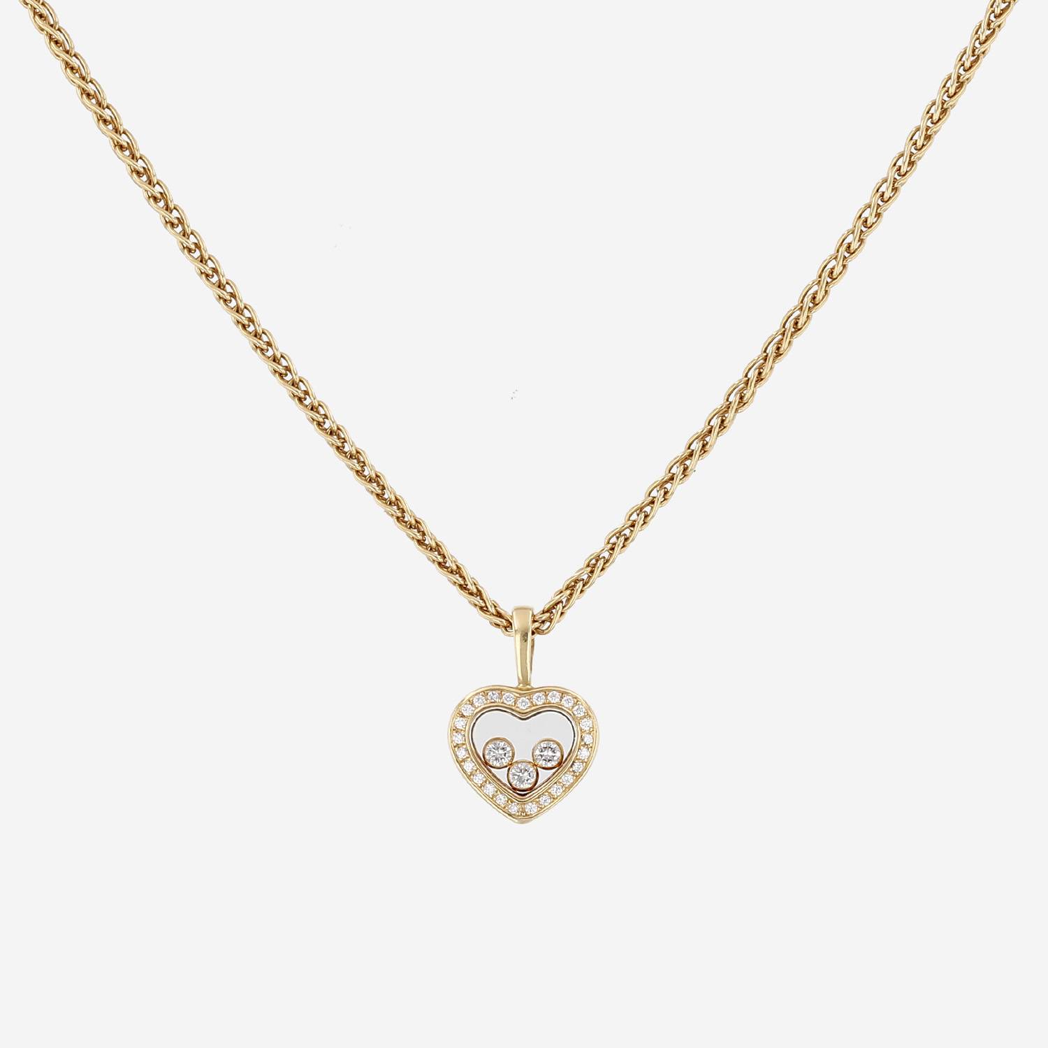 Collana Chopard Happy Diamonds in oro giallo e diamanti, dotata di un incantevole cuore traforato in oro giallo delicatamente incastonato di diamanti con taglio a brillante, ornata al centro di diamanti mobili, il tutto sostenuto da una catena in oro giallo.