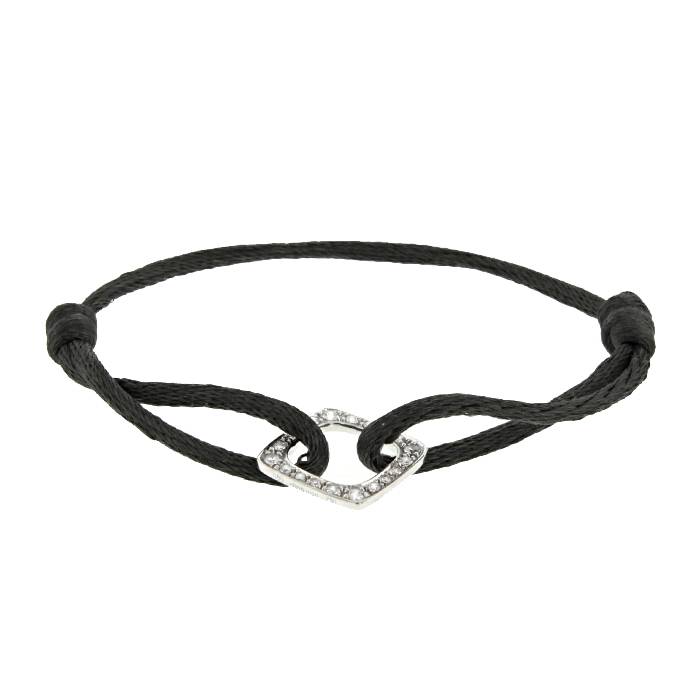 Bellissimo bracciale della collezione "Impressions" modello grande in oro bianco e diamanti, dotato di al centro un elegante motivo quadrato traforato finemente incastonato di diamanti con taglio a brillante, il tutto sostenuto da un bello cordoncino in cotone nero.