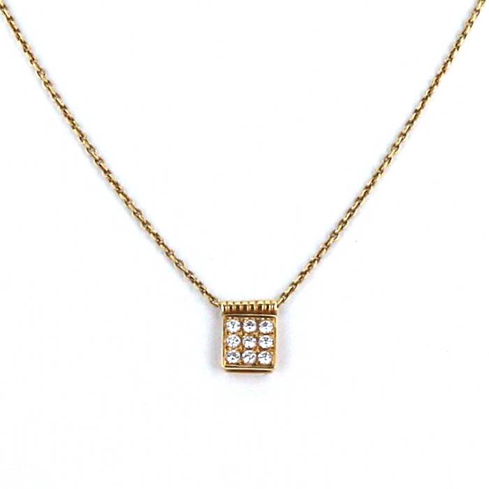 Raffinata collana Dior in oro giallo e diamanti, composta da un incantevole motivo quadrato in oro giallo delicatamente tempestato di diamanti con taglio a brillante da 0.20 carati totale, il tutto sostenuta da una bella catena in oro giallo.