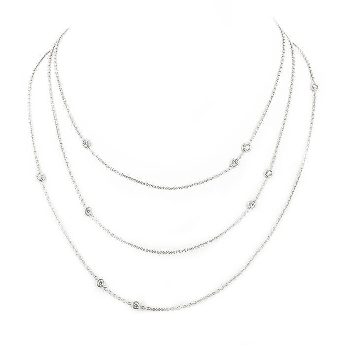 Splendida collana lunga della collezione "Mimioui" in oro bianco e diamanti, composta da una raffinata catena, arricchita di 16 diamanti con taglio a brillante.