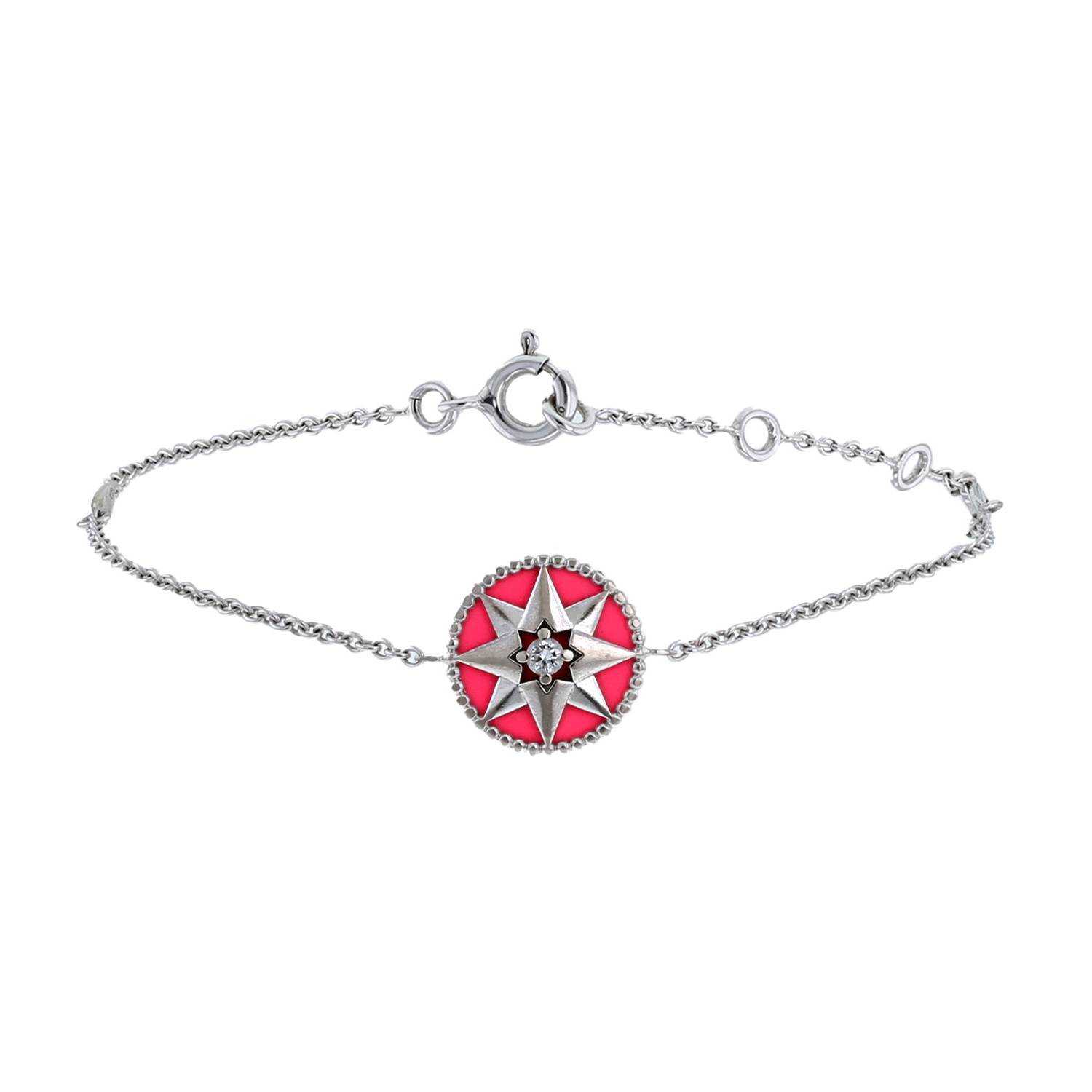 Bracciale Dior Rose des vents in oro bianco, in ceramica rosa, e diamante, composto da un bellissimo disco bombato in ceramica rosa, ornato da una bellissima stella geometrica in oro bianco delicatamente incastonata da un diamante con taglio a brillante, arricchito da una incantevole bordo perlato.