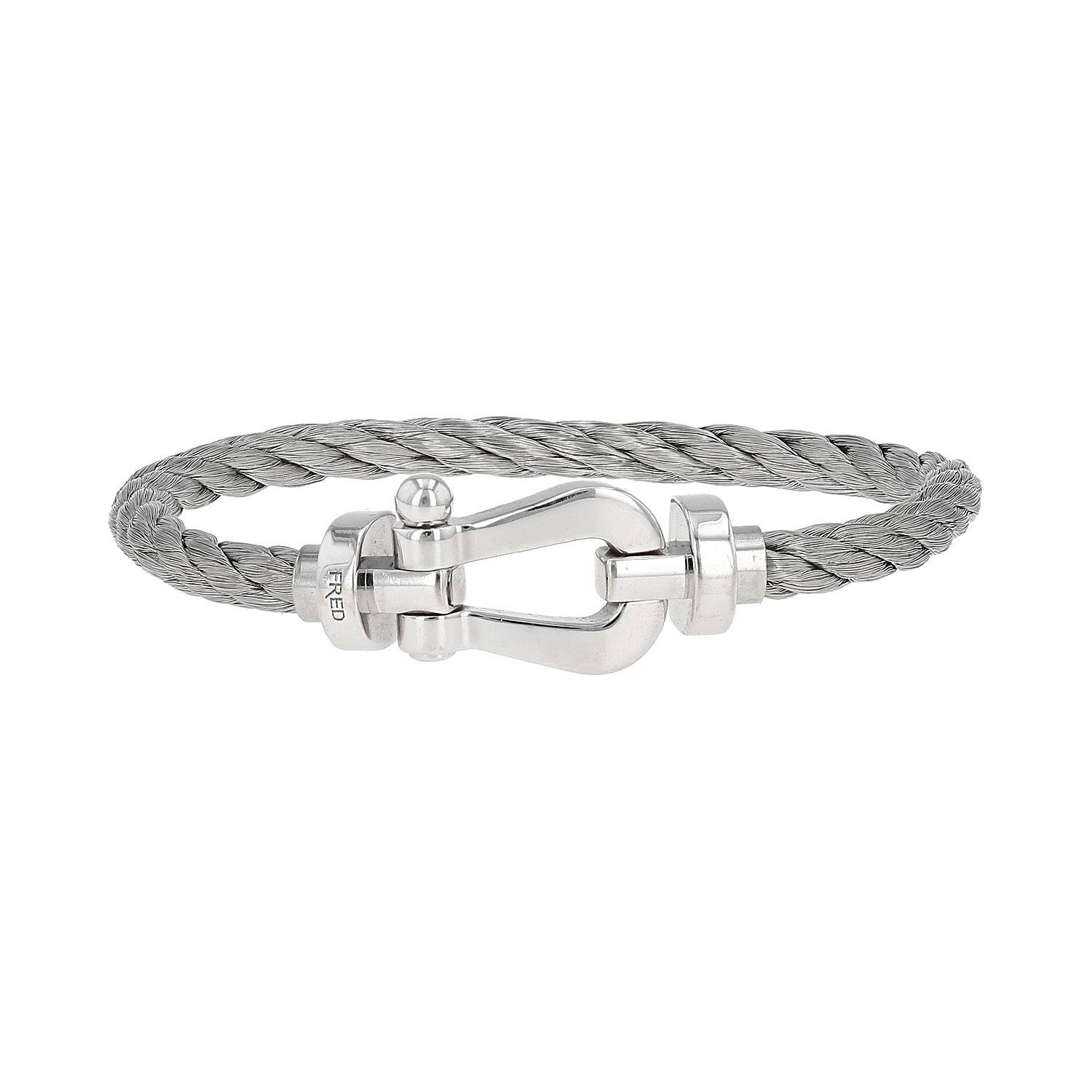 Bracciale Fred Force 10 modello grande in oro bianco, e acciaio, composto dell' intramontabile moschettone geometrico in oro bianco, arricchito da un bello filo intrecciato in acciaio.