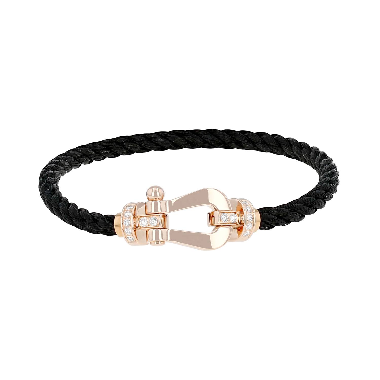 Bracciale Fred Force 10 modello grande in oro rosa, in diamanti, e nylon, composto da una moschettone in oro rosa parzialmente incastonato di diamanti con taglio a brillante 0.25 carati di circa, arricchito da un filo intrecciato in nylon nero.