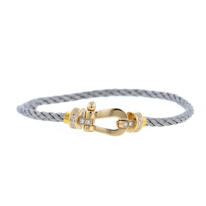 Intramontabile bracciale Fred Force 10 modello medio in oro giallo, diamanti e acciaio, dotato di un elegante moschettone geometrico in oro giallo parzialmente incastonato di diamanti con taglio a brillante, arricchito da un importante filo intrecciato in acciaio.