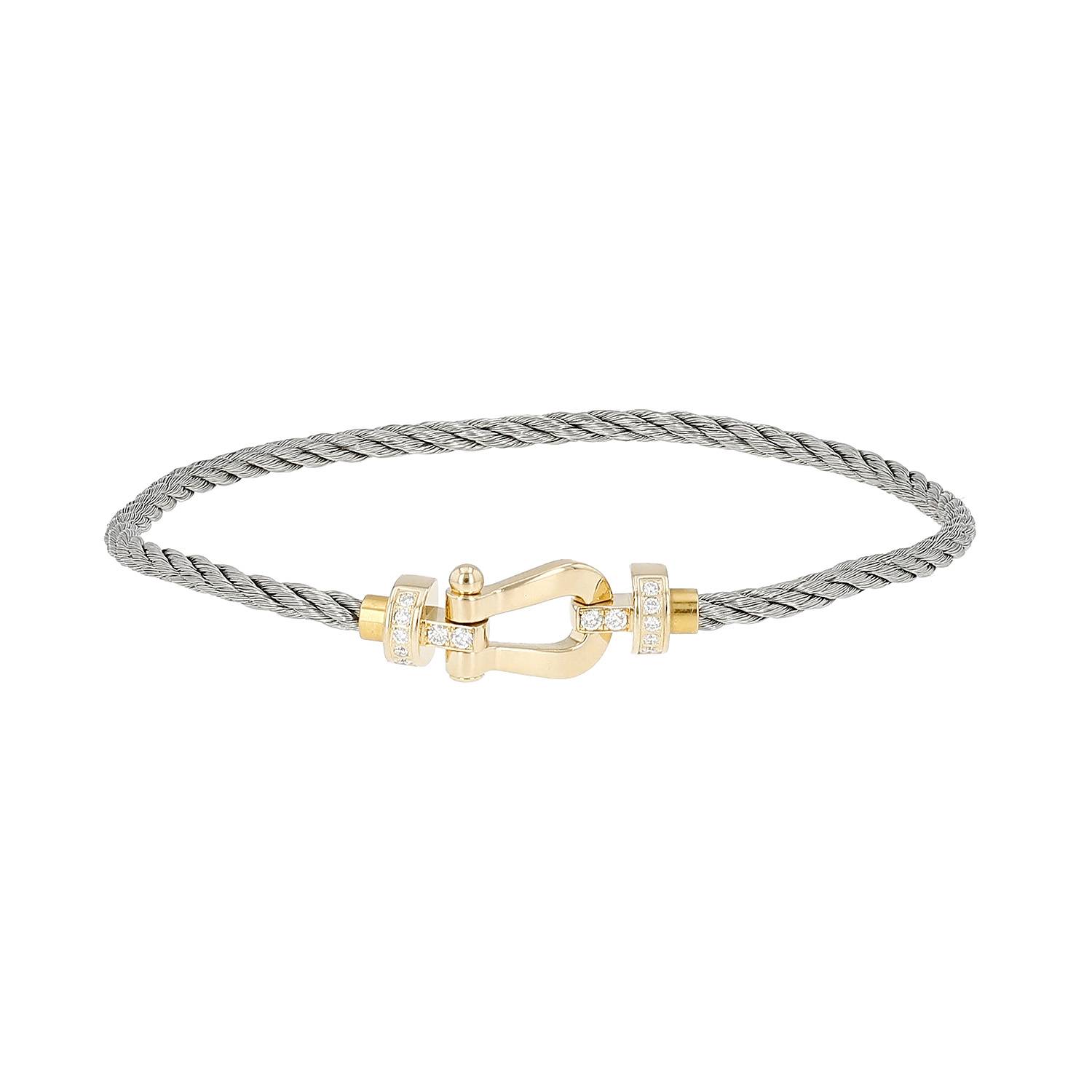 Bracciale Fred Force 10 modello piccolo in oro giallo, in diamanti, e acciaio, composto da una moschettone in oro giallo parzialmente incastonato di diamanti con taglio a brillante 0.15 carati di circa, arricchito da un filo intrecciato in acciaio.