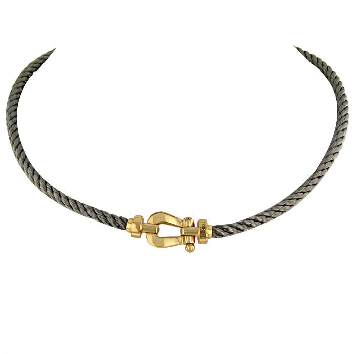 Intramontabile collana Fred Force 10 in oro giallo e acciaio, dotata di un elegante moschettone geometrico in oro giallo, arricchita da un importante filo intrecciato in acciaio.