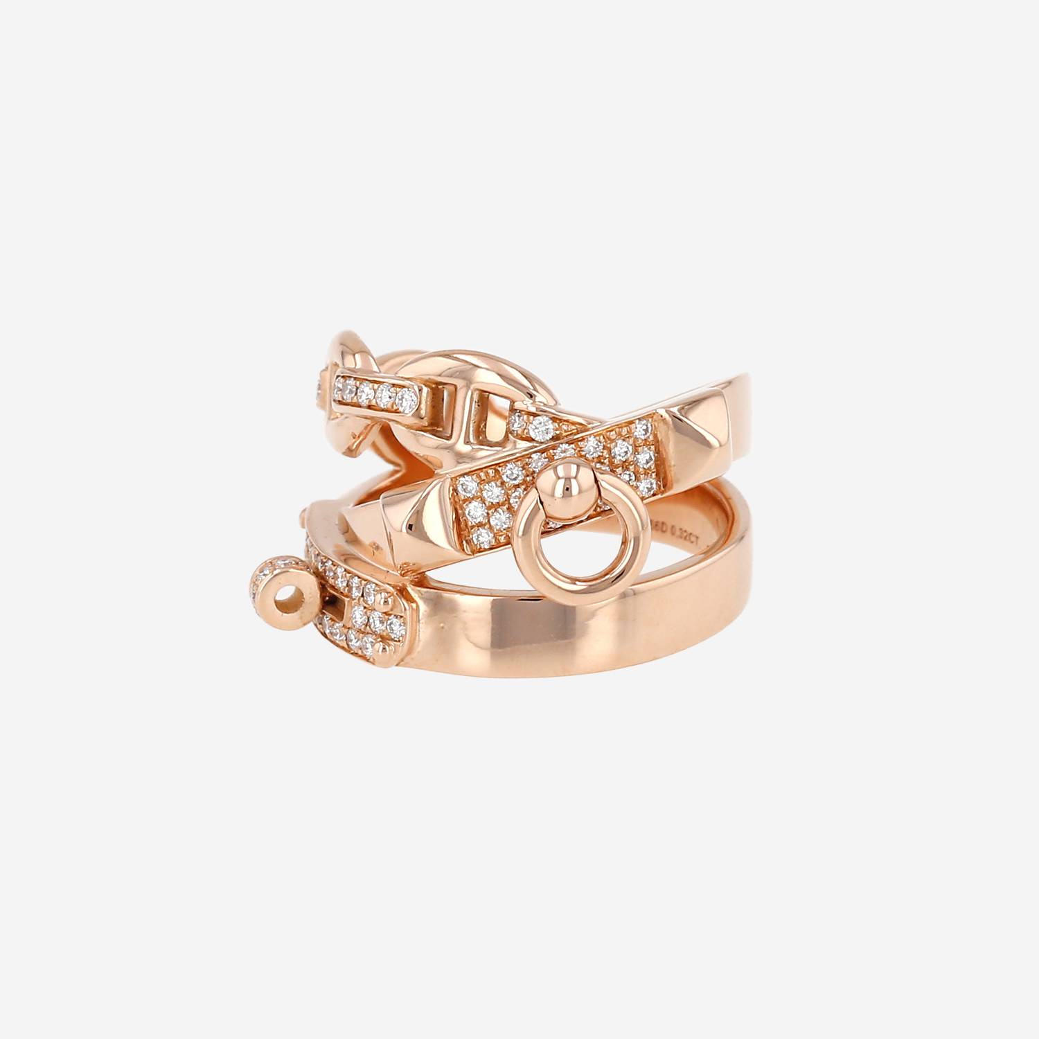Anello Hermès Alchimie in oro rosa e diamanti, composto da una sovrapposizione di 3 montature intrecciate in oro rosa parzialmente incastonate di diamanti con taglio a brillante di 0.32 carati di totale, ornato da un chiusura Kelly, da un motivo Collier de chien da una successione di maglie a catena d'ancora.