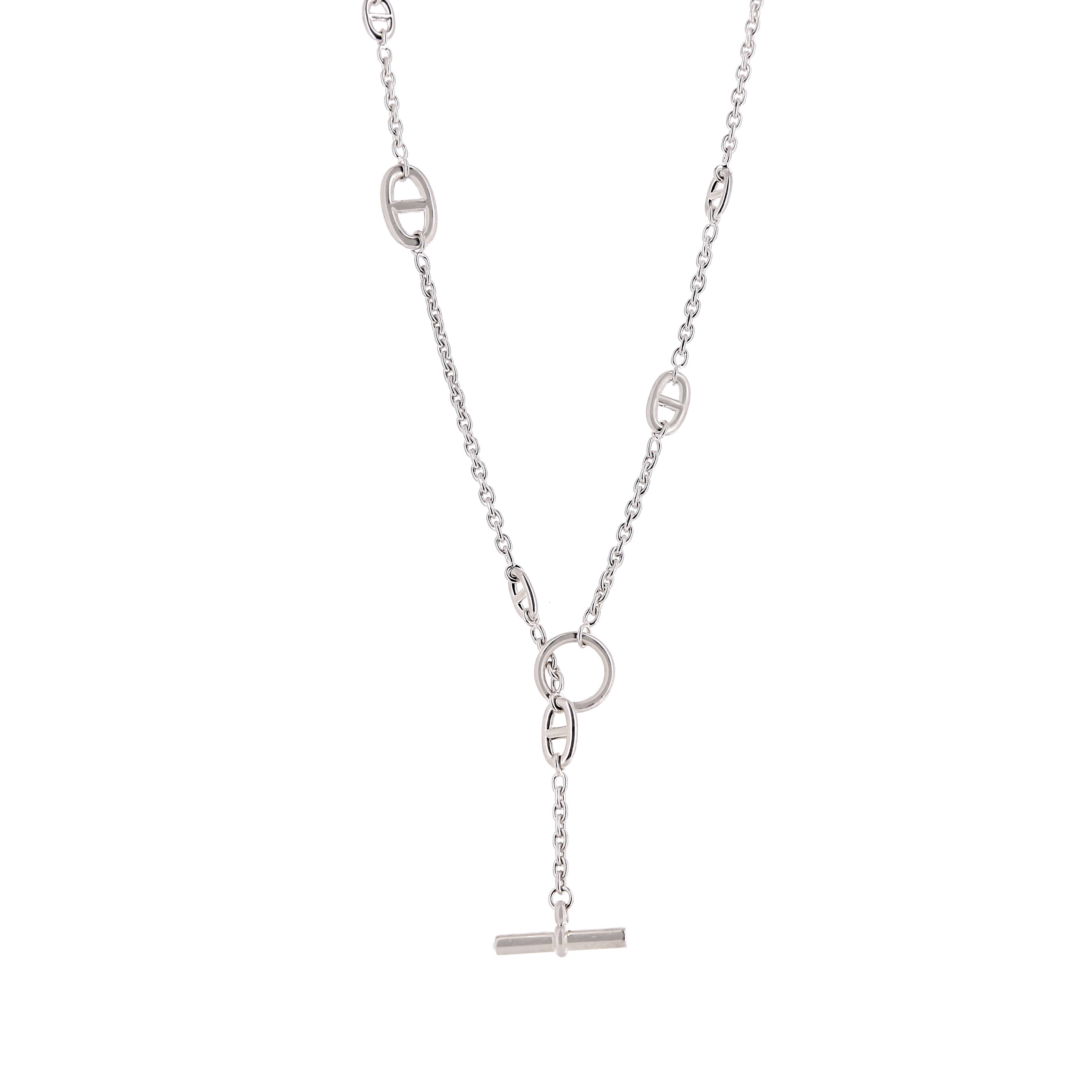 Splendida collana lunga Hermes Chaine d'Ancre in argento, composta da una successione di eleganti maglie ovali traforate in argento, il tutto sostenuta da una bella catena in argento.