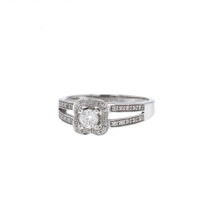 Splendido anello in oro bianco e diamanti, dotato di un raffinato fiore quadrilobato finemente incastonato di diamanti con taglio a brillante, ornato al centro da un diamante con taglio a brillante del peso di in totale 0.20 carati, circondato undefined undefined undefined undefined di diamanti con taglio a brillante.
