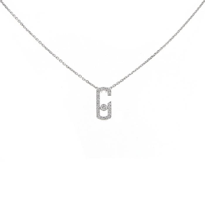 Splendida collana Messika Move in oro bianco 14k e diamanti, composta da un elegante motivo geometrico traforato in oro bianco 14k delicatamente tempestato di diamanti con taglio a brillante, ornata al centro da un bellissimo diamante con taglio a brillante del peso circa di 0.05 carati, il tutto sostenuta da una sottile catena in oro bianco.