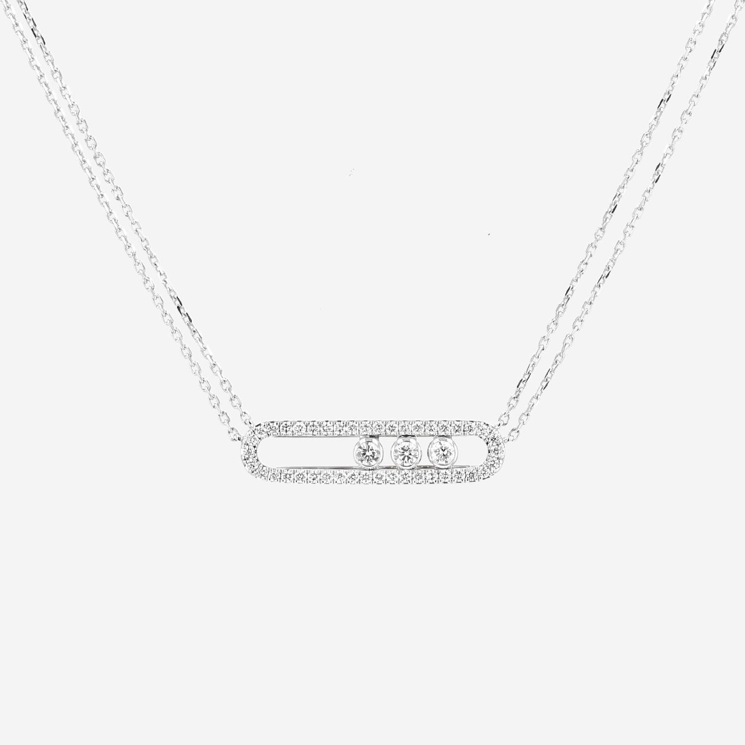 Collana Messika Move in oro bianco e diamanti, composta da un elegante motivo ovale traforato in oro bianco delicatamente incastonato di diamanti con taglio a brillante 0.45 carati di circa, ornata al centro di magnifici diamanti mobili con taglio a brillante del peso circa 0.22 carati, il tutto sostenuto da delle catene a maglia forzatina in oro bianco.