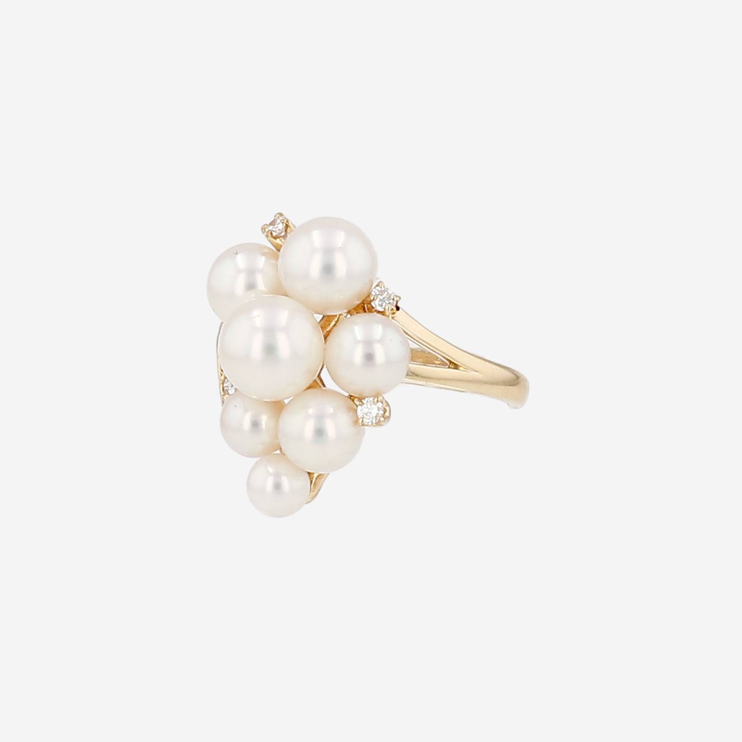 Anello Mikimoto in oro giallo, in perle coltivate, e diamanti, composto da un montatura in oro giallo, ornato di elegantissimi perle coltivate, arricchito di piccoli diamanti con taglio a brillante circa 0.05 carati.