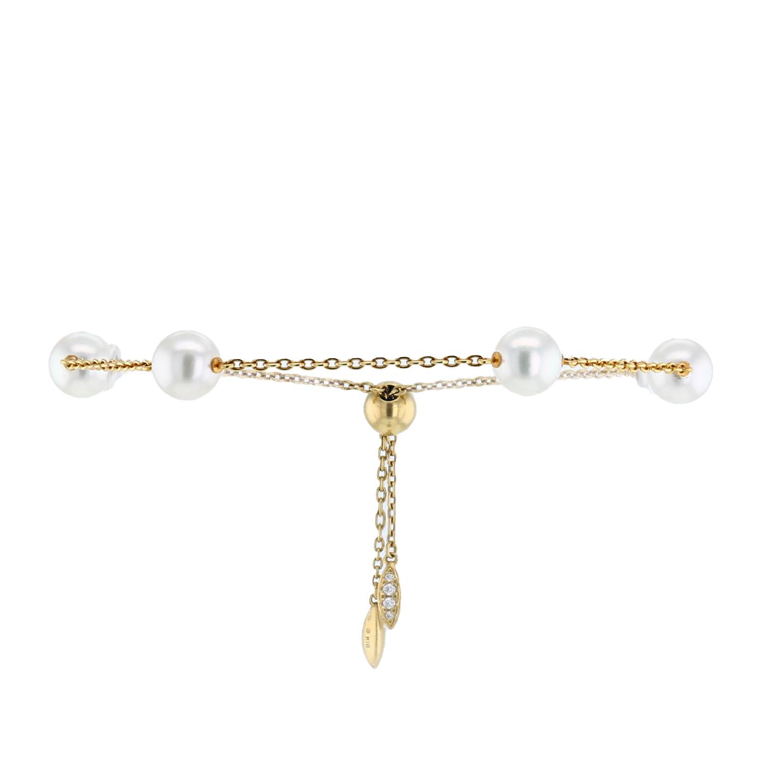 Bracciale Mikimoto in oro giallo, in perle coltivate, e diamanti, composto da una catena a maglia forzatina in oro giallo, che sostengono da una successione di 4 splendida perla Akoya, arricchito alle estremità di raffinate piccole foglie incastonate di 0,06 carati diamanti con taglio a brillante.