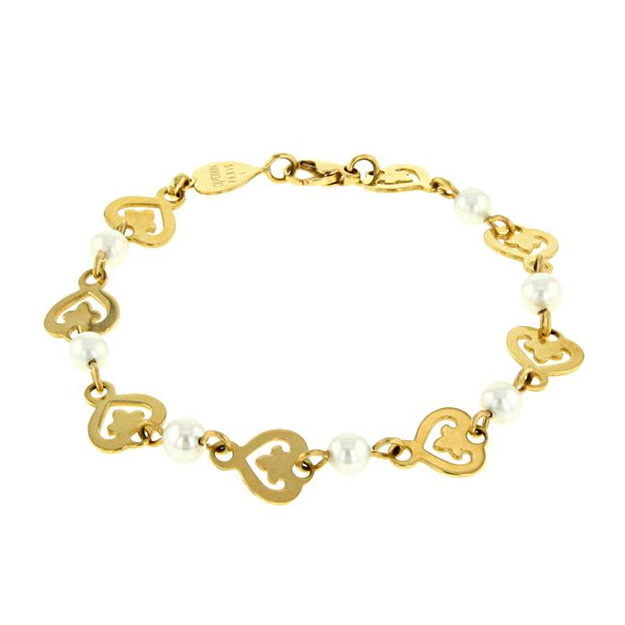 Bellissimo bracciale O.J. Perrin Légende in oro giallo e perle, composto da una successione di raffinati cuori geometrici traforate, arricchito bellissime perle rotonde.