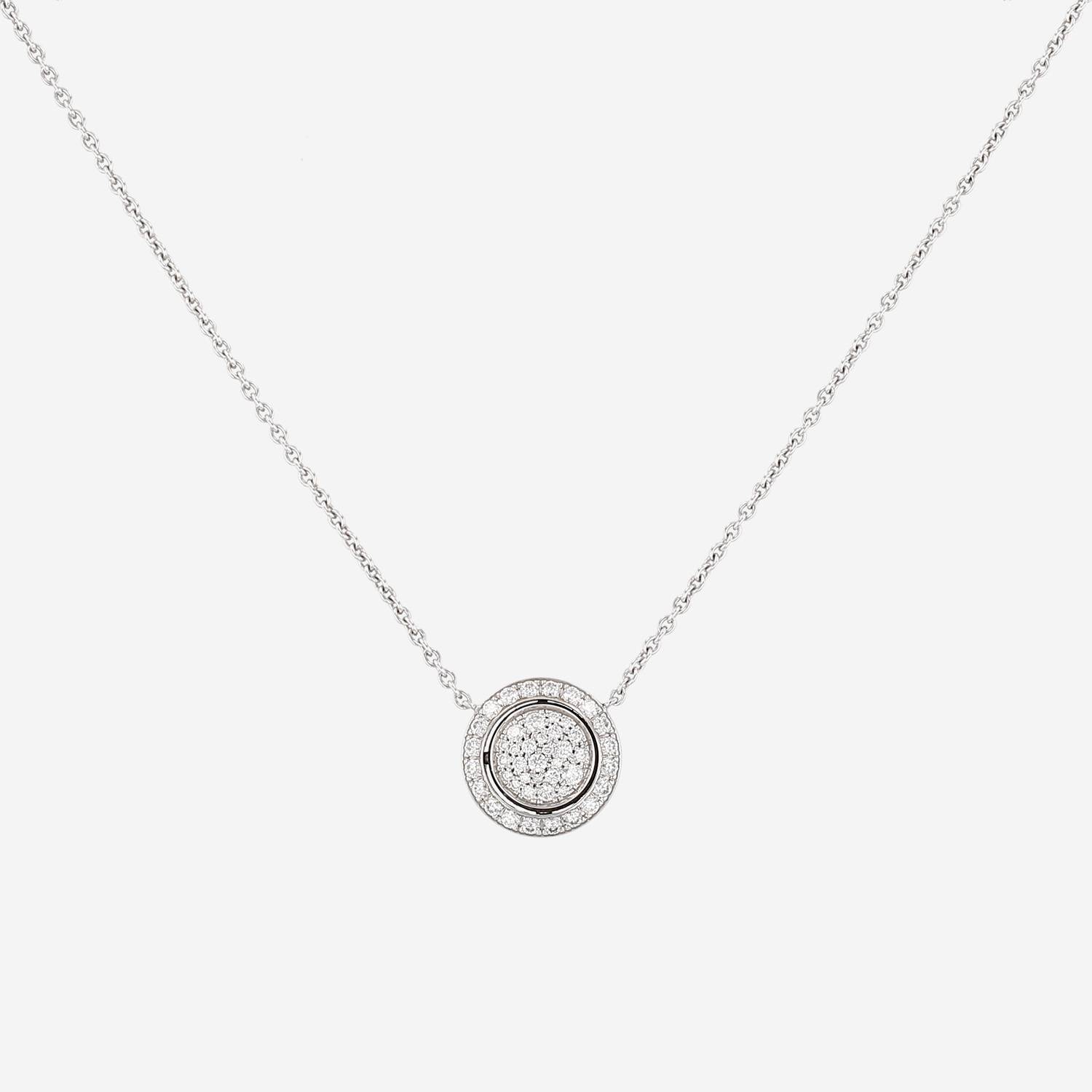 Ciondolo girevole Piaget Possession in oro bianco e diamanti, composto da un raffinato motivo rotondo in oro bianco parzialmente incastonato di diamanti con taglio a brillante, che sostengono al centro un piccolo disco girevole tempestato di diamanti con taglio a brillante di totale 0.48 carati, il tutto sostenuto da una sottile catena in oro bianco.