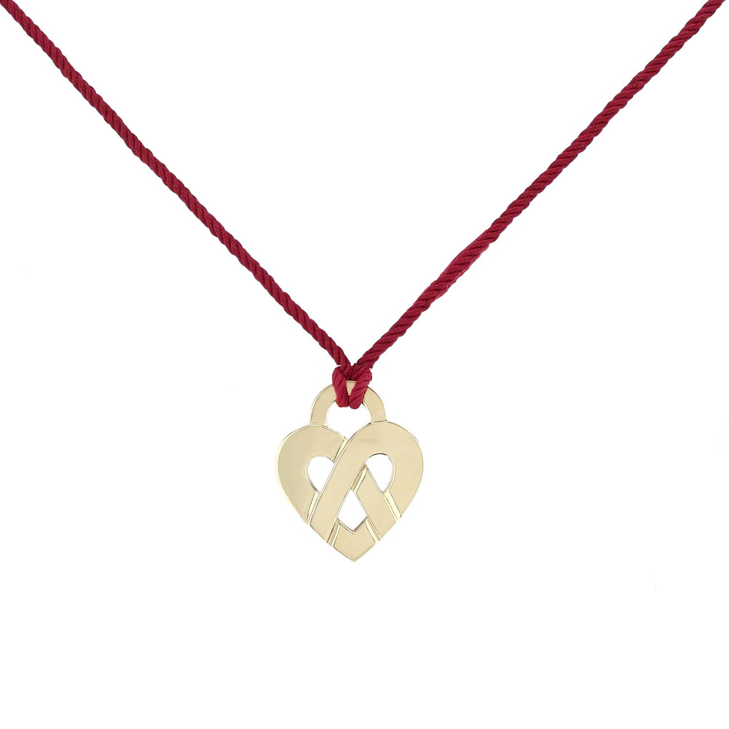 Ciondolo Poiray Coeur Entrelacé modello molto grande in oro giallo, composto da un bellissimo cuore intrecciato in oro giallo, il tutto sostenuto da un cordoncino intrecciato in seta.