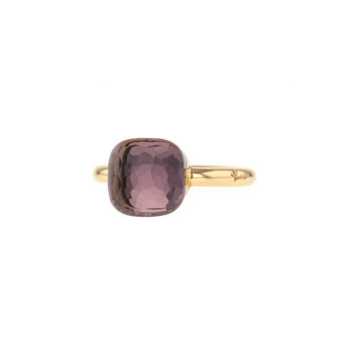 Bellissimo anello Pomellato Nudo in oro rosa e ametista rosa di Francia, ornato al centro da un importante cabochon sfaccettato in ametista rosa di Francia, arricchito da una montatura bombata in oro rosa.