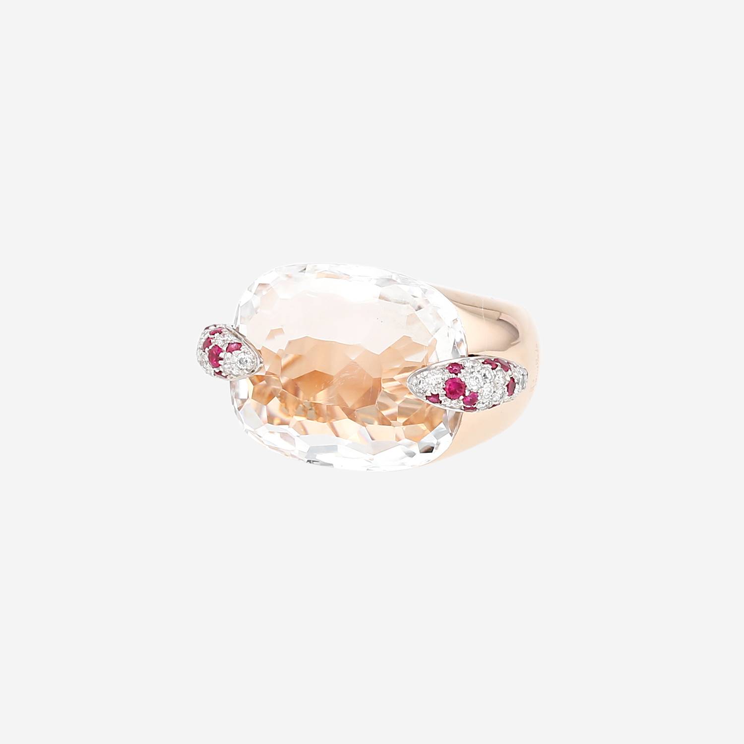 Magnifico anello Pomellato Pin Up in oro rosa, in quarzo, e rubini, composto da un importante quarzo sfaccettato, circondato di 2 graffe in oro rosa e rubini delicatamente incastonati di diamanti con taglio a brillante.