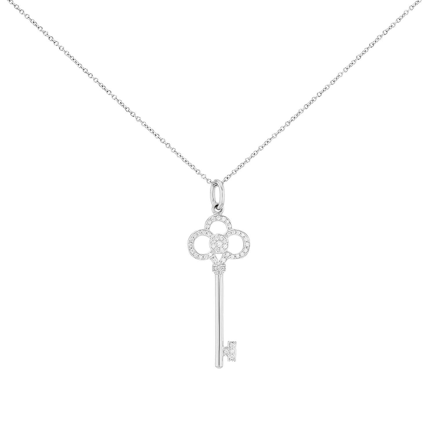 Ciondolo Tiffany & Co Clé Couronne in oro bianco e diamanti, composto da una bellissime chiavi traforate in oro bianco, ornato di diamanti con taglio a brillante del peso circa 0.20 carati, il tutto sostenuto da una sottile catena in oro bianco.
