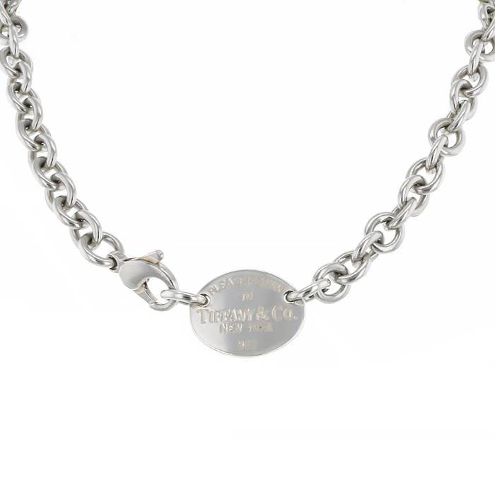 Bellissima collana Tiffany & Co Return To Tiffany in argento, composta da una elegante placca ovale incisa "Please Return To Tiffany & Co New York, il tutto sostenuta da una splendida una catena a maglie circolari in argento.