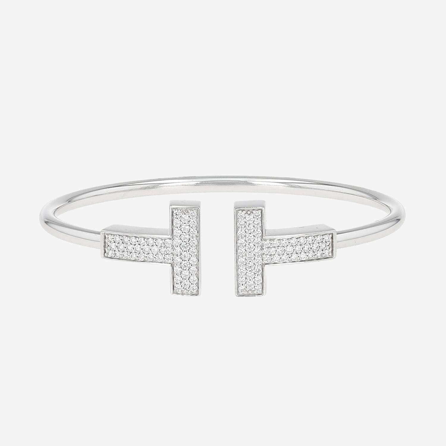 Bracciale Tiffany & Co Wire in oro bianco e diamanti, composto da un profilo in oro bianco, ornato al centro dell' intramontabile T in oro bianco delicatamente tempestata di diamanti con taglio a brillante.