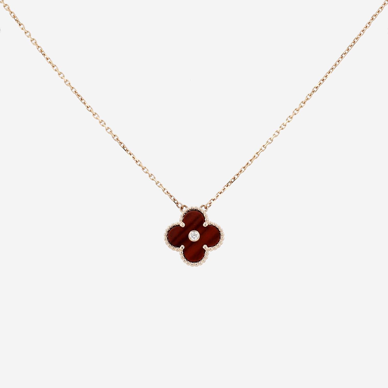 Splendida collana Van Cleef & Arpels Holiday Alhambra (2017) in oro rosa, in occhio di bue, e diamante, dotata di un elegante quadrifoglio quadrilobato in occhio di bue, ornata al centro da un diamante con taglio a brillante, arricchita da una raffinato bordo perlato in oro rosa, il tutto sostenuto da una catena a maglie forzatine in oro rosa.