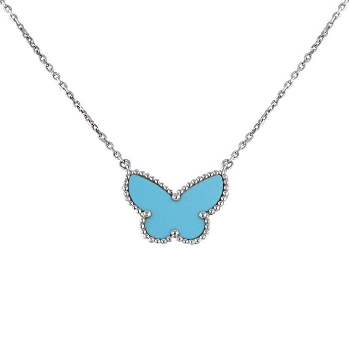 Magnifica collana Van Cleef & Arpels Lucky Alhambra in oro bianco e turchese, dotata di una elegante farfalla in turchese, arricchita da un sottile bordo perlato, il tutto sostenuta da una bellissime delle catene a maglia forzatina in oro bianco.
