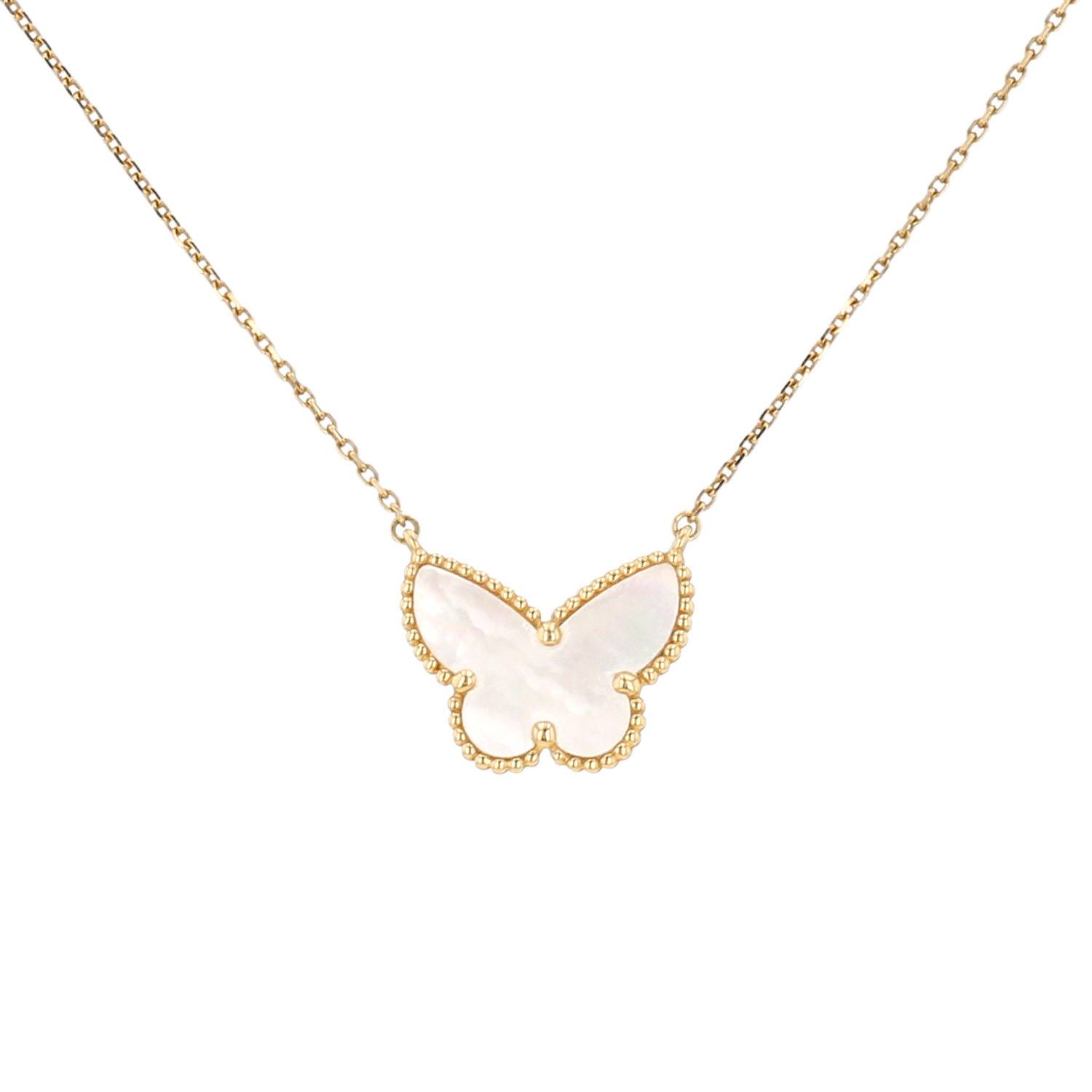 Collana Van Cleef & Arpels Lucky Alhambra in oro giallo e madreperla, composta da un bellissima farfalla in madreperla bianca, arricchita da una raffinato bordo perlato in oro giallo, il tutto sostenuto da una catena a maglie forzatine in oro giallo.