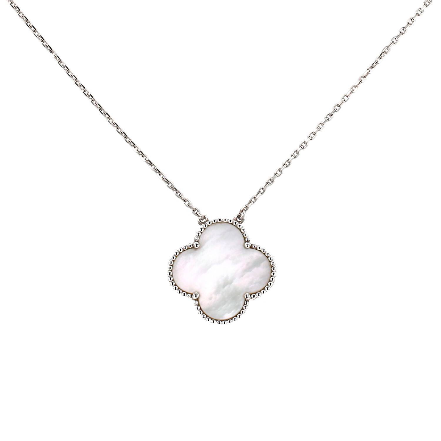 Collana Van Cleef & Arpels Magic Alhambra in oro bianco e madreperla, composta di maglie forzatine in oro bianco, ornata da un quadrifoglio polilobato in madreperla, circondata da una elegante bordo perlato in oro bianco.