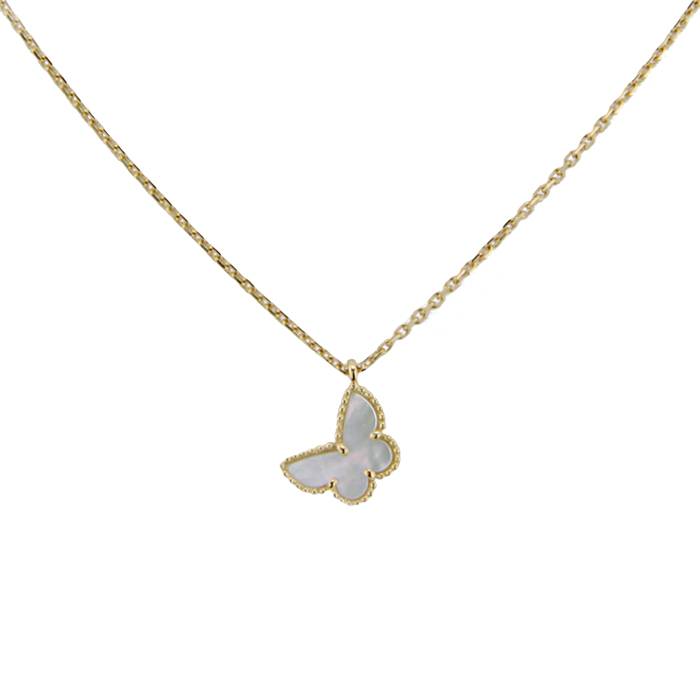 Raffinata collana della collezione "Sweet Alhambra" in oro giallo e madreperla bianca, con un'elegante farfalla geometrica in madreperla, arricchita undefined undefined undefined, il tutto sostenuta da una sottile catena a maglie forzatine in oro giallo.