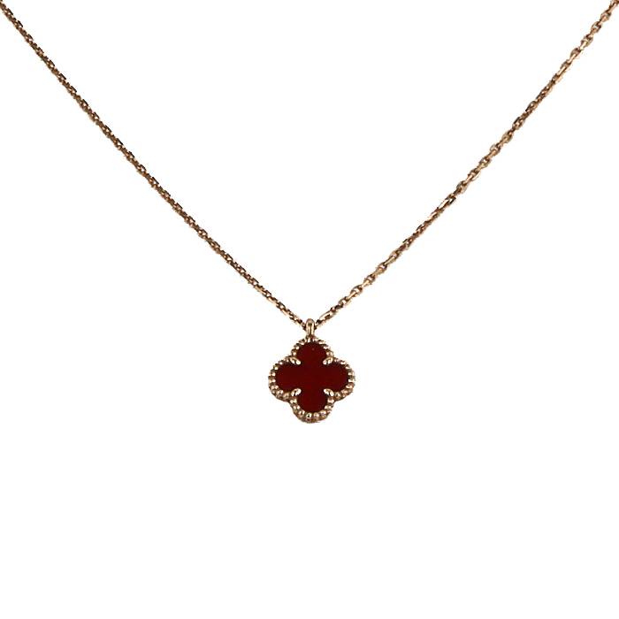 Incantevole collana Van Cleef & Arpels Sweet Alhambra in oro rosa e corniola, composta da una raffinata catena in oro rosa, che sostengono al centro un bellissimo quadrifoglio polilobato in corniola, arricchita da un bello bordo perlato in oro rosa.