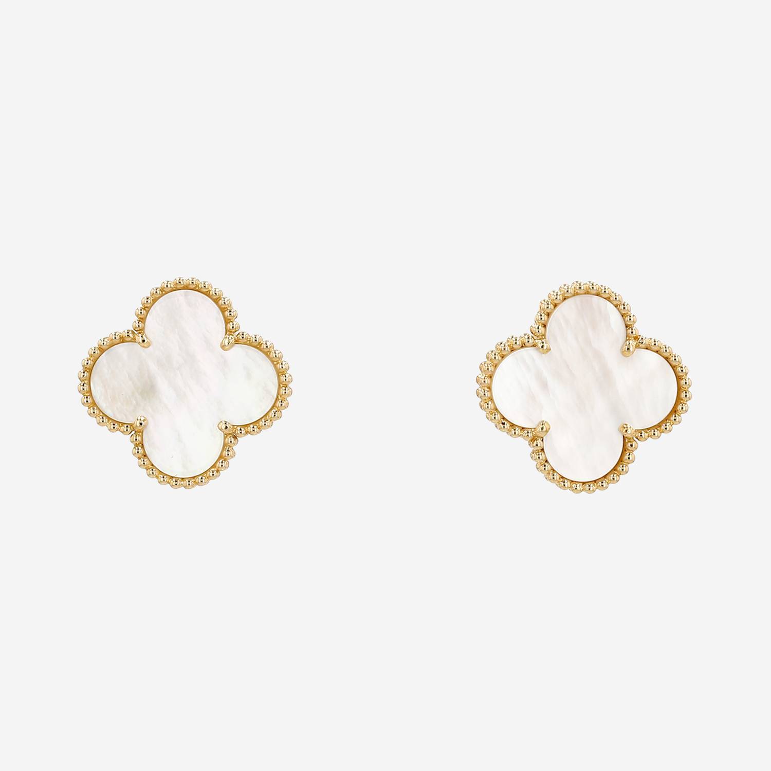 Orecchini Van Cleef & Arpels Magic Alhambra in oro giallo e madreperla, composti di 2 inimitabili quadrifogli quadrilobati in madreperla, ornati da una raffinato bordo perlato in oro giallo.