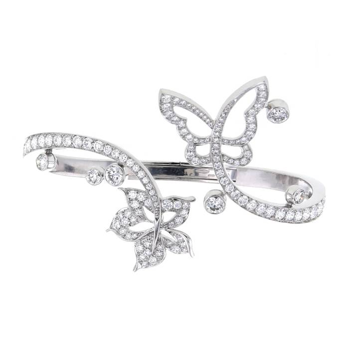 Splendido bracciale Van Cleef & Arpels in oro bianco e diamanti, composto da una bella farfalla traforata in oro bianco delicatamente tempestata di diamanti con taglio a brillante da 1.50 carati totale, ornato da una graziosa foglia traforata in oro bianco interamente tempestata di diamanti con taglio a brillante, arricchito da un elegante profilo ondulato apribile in oro bianco parzialmente tempestato di diamanti con taglio a brillante.