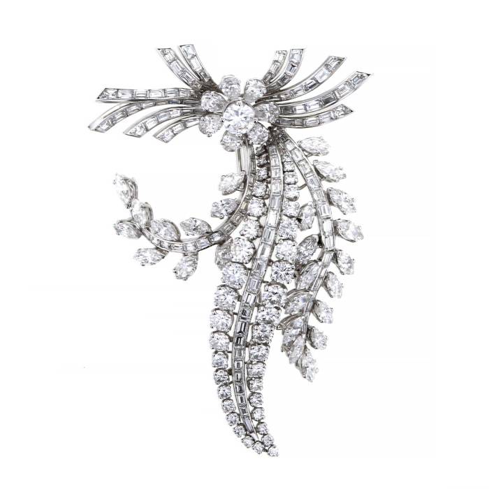 Splendida spilla Vintage in platino e diamanti, composta da un splendido fiore delicatamente incastonato di diamanti con taglio a brillante, che sostengono una bellissimi foglie elegantemente incastonate di diamanti con taglio Marquise arricchite di elementi finemente incastonato di diamanti con taglio baguette, arricchita di magnifici diamanti con taglio a brillante totale 22 carati.