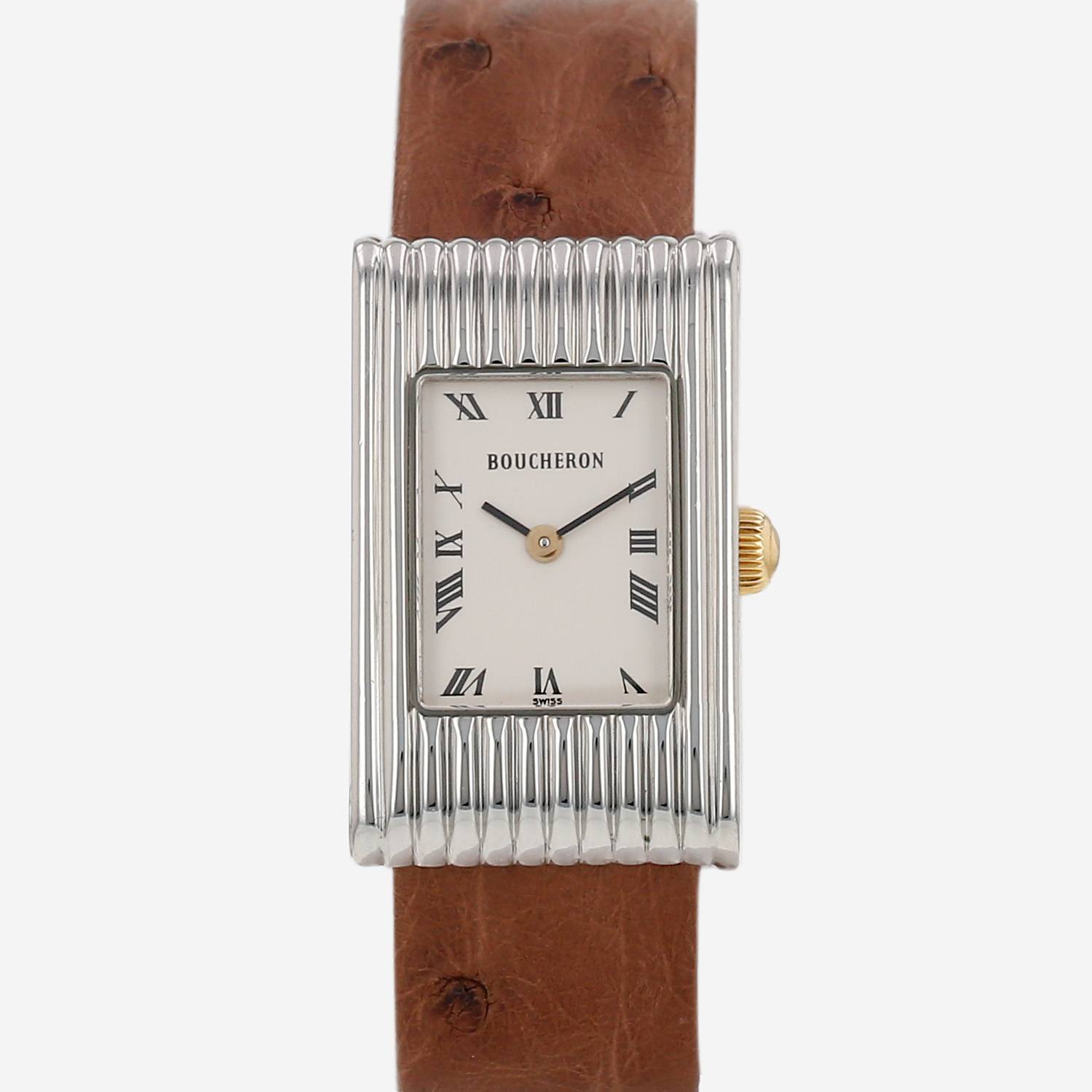 Orologio da polso Boucheron Reflet in acciaio. Cassa rettangolare in acciaio con godronatura, fondo cassa avvitato, corona scanalata.