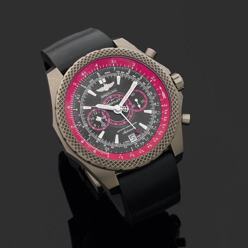 Descrizione : POUR BENTLEY RÉF. E.27365 SÉRIE LIMITÉE A 1000 EXEMPLAIRES Montre bracelet en titane avec chronographe. Cadran noir et rouge avec index appliqués et aiguilles luminescents, guichet dateur à 6h. Trois compteurs pour la petite seconde et totalisateur des 12 heures du chrono. Lunette tournante en titane guilloché avec règle à calculs. Mouvement automatique, certifié Cosc. Couronne et fond vissés, étanche 100 m. Bracelet caoutchouc noir avec boucle déployante Breitling en titane. Cadran, boîtier et mouvement signés. Edition limitée 839/1000 et numérotée E27365 et 2420767. Diam. 51 mm. Accompagnée de son écrin et certificat.Leggi la descrizione dell'espertoBREITLING