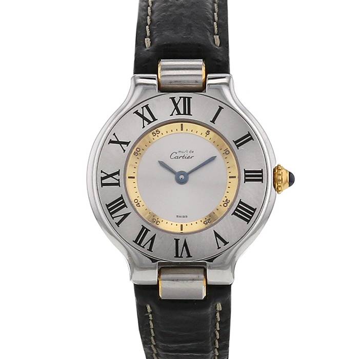 Elegante orologio da donna Cartier Must 21 in acciaio e oro placcato. Cassa rotonda in acciaio, fondo cassa avvitato, corona incastonata con un cabochon in zaffiro.