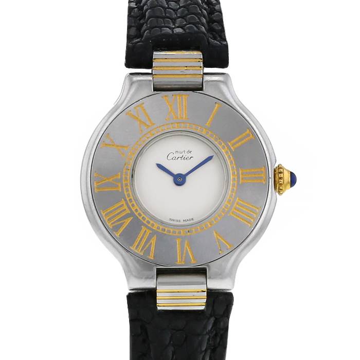 Orologio da polso Cartier Must 21 in acciaio e oro placcato. Cassa rotonda in acciaio, corona incastonata con un cabochon in zaffiro.